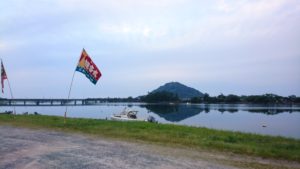 明日は恒例のおしくらごうがあります。(椿東小学校は運動会!)気になる天気もどうにか持ちそうです。準備が着々と進められていました。会場や橋には年代物の大漁旗がはためいていて、歴史とワクワク感を感じました。