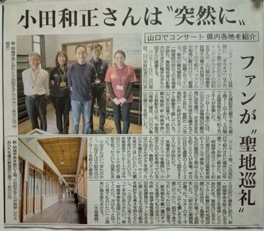 本日の山口新聞に、小田和正さんコンサートの中の「ご当地紀行」で小田さんが訪れた場所が賑わってるとありました。やはりすごい影響力です🤣 「来たかった❢」と突然の来萩。来館者も倍増とか。このチャンスを活かしてほしいです。 カテゴリー: ブログ 7件のコメント ながたにSJ恵三 · 2023年6月26日 11:37 PM さすがですねー。この影響力ですね。小田さん人形、人気者なのですね。なんと同窓会の2日前に萩に来てたとは。私たちはみんな小田和正さんの余韻に浸された感じだったのですね。すばらしい。このチャンスと経験を生かしてほしいです。 ながたにSJ恵三 · 2023年6月27日 7:52 AM なぜ、小田和正さんは、萩に来たかったのでしょうか? 何に引かれたのでしょうか? 萩活性化の大きなヒントになりそうですね。 bunbun · 2023年6月27日 10:01 AM ありがたいですよね〜。なぜ来たかったか?ですが。おそらく小田さんは東北大学、早稲田大学の院で建築学を学ばれているので、木造建築への関心が高いのではと思います。以前、同じご当地紀行で訪れた錦帯橋を「去り難い❢」と言われてました、明倫学舎では構造の展示もあるので、もっとゆっくり見たかったのでは!なんて思います。そしてなにより萩駅舎に行かれた事に感動します。ライトアップした駅舎も見てほしい。また東北大学を選んだ理由の1つに周りの景色が気にいって、、、とあり、ご当地紀行でも山口市の緑多い景色を褒めてました。すみません、すっかりファントークになってしまいました🙏 いずれにしてもこのチャンスをしっかり活かしてほしいですよね🤣 ながたにSJ恵三 · 2023年6月27日 10:28 AM 明確なご回答及び分析、誠にありがとうございます。さすが推しメンですね。このようなチャンスはもっといろいろあるとおもいます。本当にしっかり活かせればいいですね。 bunbun · 2023年6月27日 1:22 PM ありがとうございます。あくまで私見です(笑)1つの建築物から感じ取られるものがすごくたくさんあるのだろうなぁて思います。 壊すと二度と作れない、先人達が知恵と技術を結集しそれを支えた財。時代的背景もありますが、宝を今の視点で伝えられたらなぁと願いますね〜。古地図で歩ける街、萩市を世界遺産にとこだわられた方々の思いも感じます。 今夜、焼き増し写真仕分作業をします。いただいたアレを皆でサクサクいただこうと思います。ありがとうございます😆 ながたにSJ恵三 · 2023年6月27日 2:02 PM すばらしいコメント誠にありがとうございます。 今夜の作業、本当にお疲れさまです。みなさんによろしくお伝えください。いつもいつも感謝です。 bunbun · 2023年6月27日 5:43 PM いつも温かい励ましをありがとうございます。萩は32℃てとても暑い1日でしたが、夜の作業も熱いかも〜。また様子をアップしますね、お楽しみに。 コメントを残す コメントをキャンセル メールアドレスが公開されることはありません。 * が付いている欄は必須項目です 名前 * メール * サイト ご意見、ご感想をお願いします。 次回のコメントで使用するためブラウザーに自分の名前、メールアドレス、サイトを保存する。