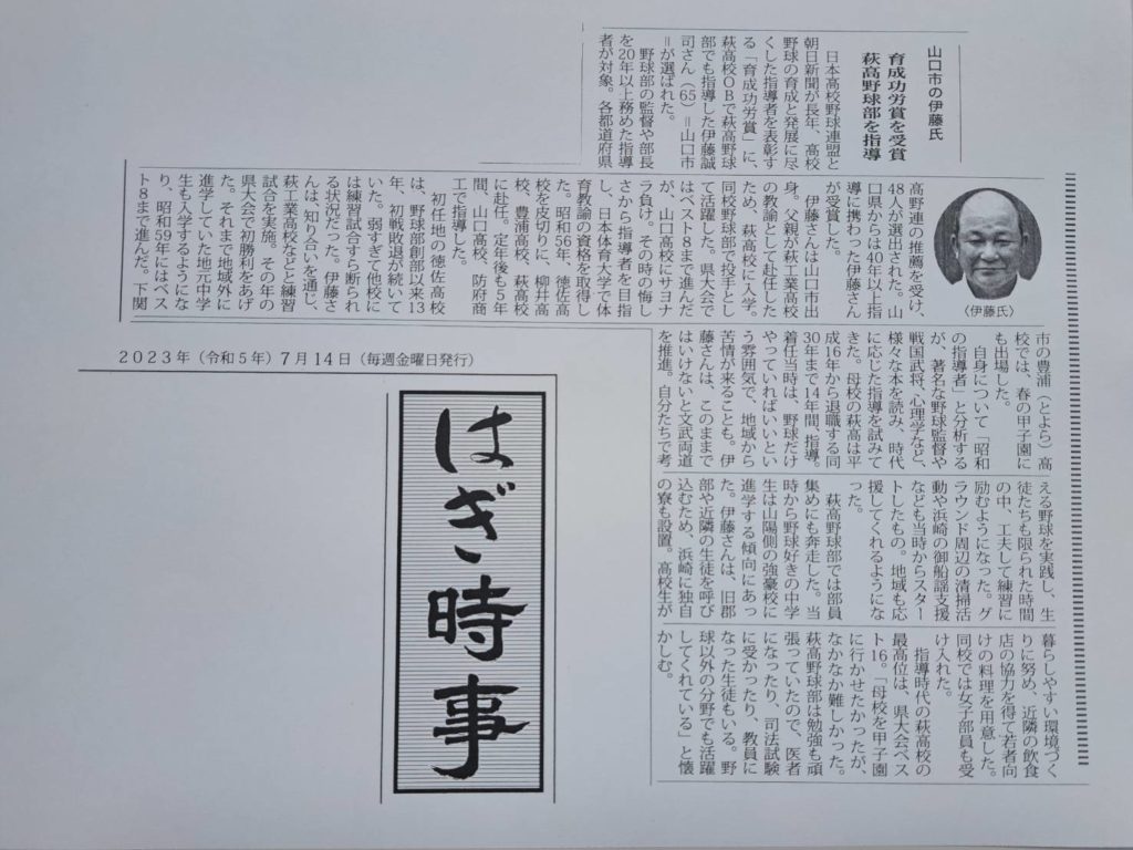 第105回全国高校野球選手権記念 山口大会。豪雨のため開会が遅れたものの、その後は順調に熱戦が繰り広げられ、嬉しいことに萩高、萩商工ともに初戦突破👏。萩商工は昨日2回戦も突破しました👏👏。萩高も2回戦は慶進と対戦します。頑張れ〜👏👏👏 先日お知らせした伊藤君。「はぎ時事」でも紹介されました🎊 対戦は本日。このあと12:30から。応援よろしくお願いします🤗 カテゴリー: ブログ 3件のコメント SJながたに · 2023年7月17日 9:40 AM おはようございます。昨日は、萩高残念でしたね。3年生は新たな道を開くことになりますが、伊藤くんのように指導者を目指すのも素晴らしいと思います。 はぎ時事の中で伊藤くんが自身について「昭和の指導者」と分析しているところは、かっこいいですね。教え子の野球部員で、医者や教員等、そして司法試験合格者がいるなん本当に素晴らしいですね。人生ですね。私も頑張ります。 SJながたに · 2023年7月20日 11:02 PM 萩商工もよく頑張りましたが、残念でした。萩勢はよくやりました。ありがとうございました。 甲子園では、山口県代表をみなさんで応援しましょう。楽しみですね。 bunbun · 2023年7月22日 4:45 PM ベスト4が出揃いましたよ。 高川学園、宇部鴻城、徳山、南陽工。今日の2試合はどちらも延長の末のサヨナラ。下関国際が敗れました😰 コメントを残す コメントをキャンセル メールアドレスが公開されることはありません。 * が付いている欄は必須項目です 名前 * メール * サイト ご意見、ご感想をお願いします。 次回のコメントで使用するためブラウザーに自分の名前、メールアドレス、サイトを保存する。